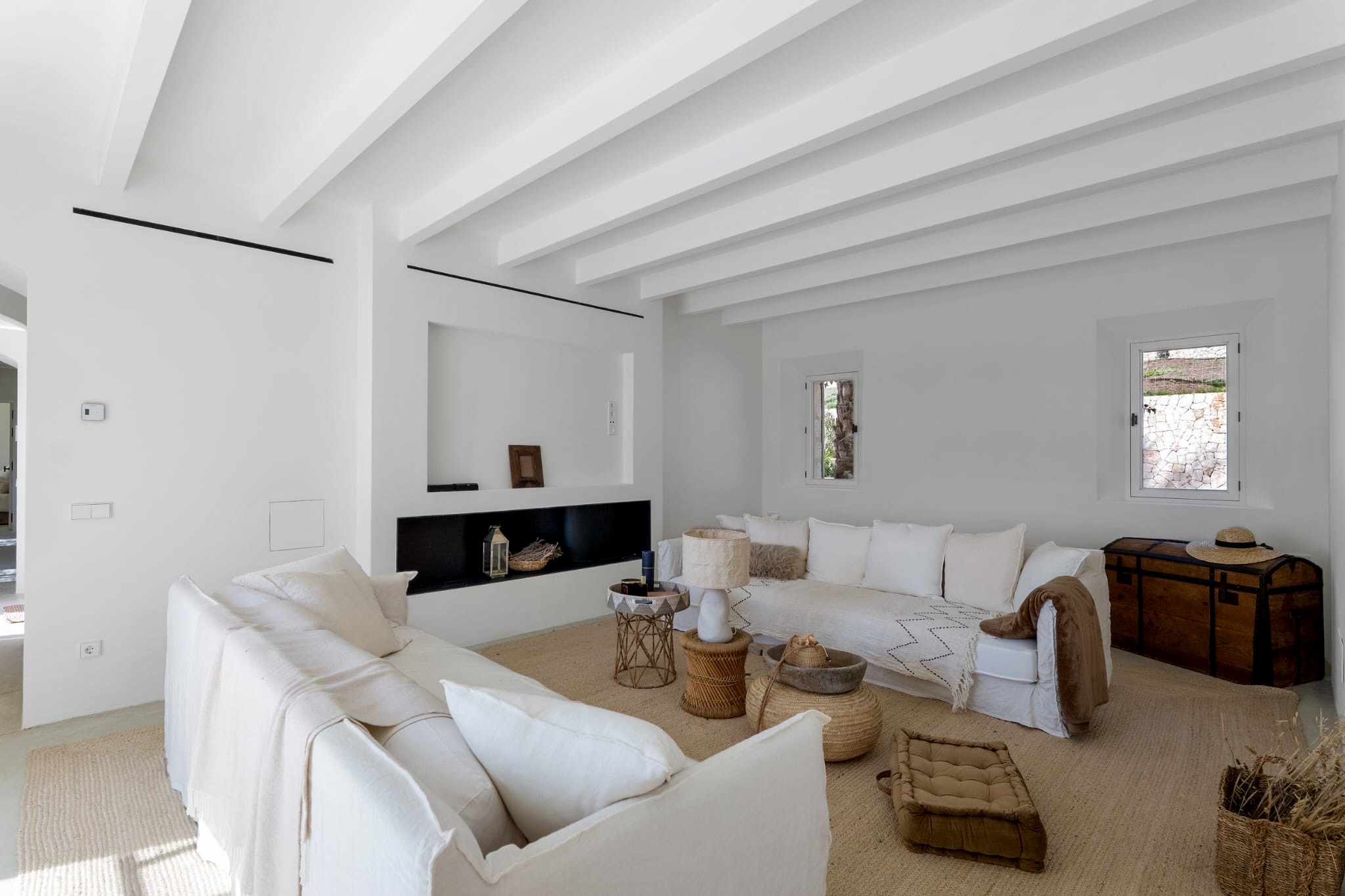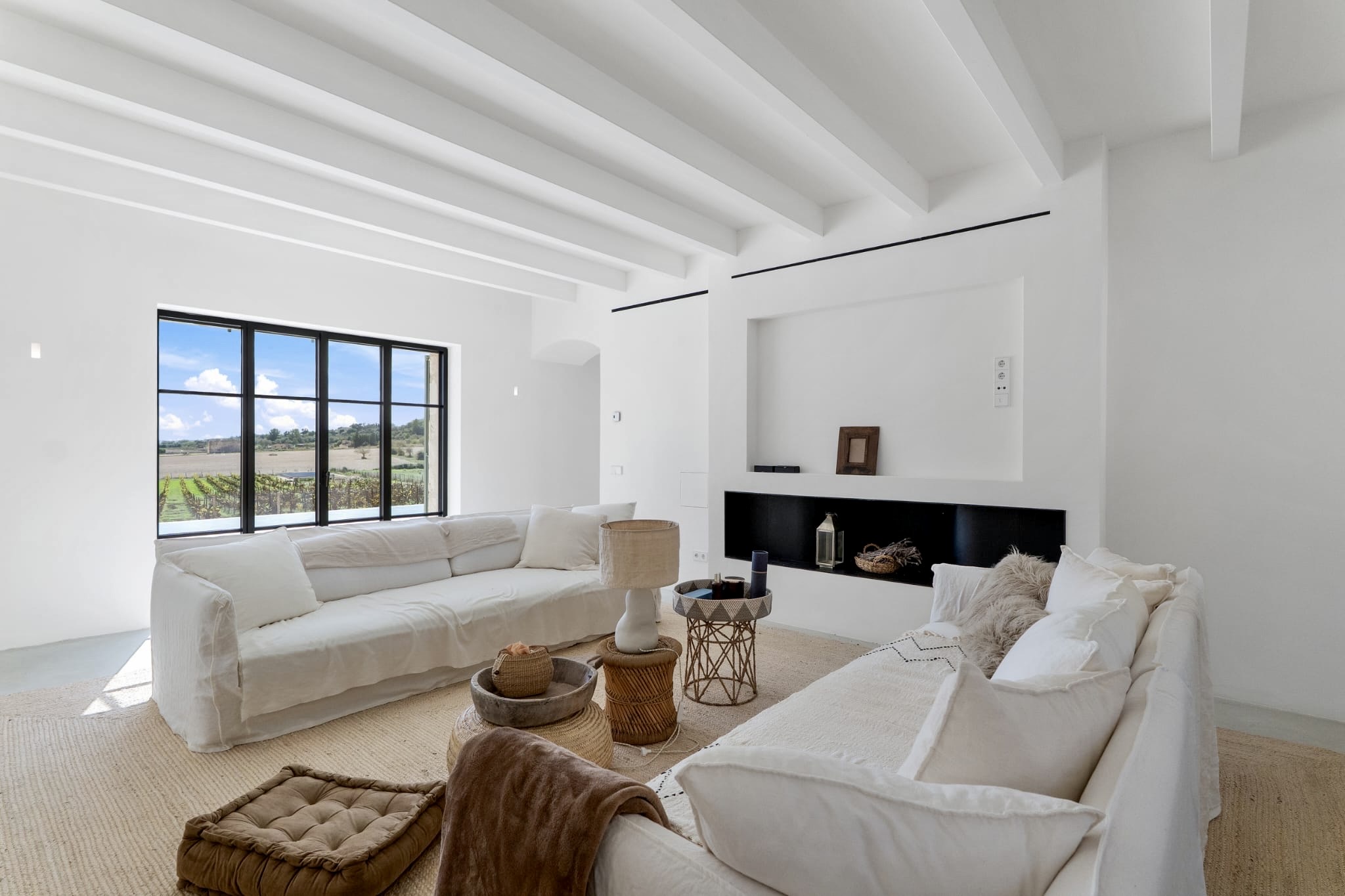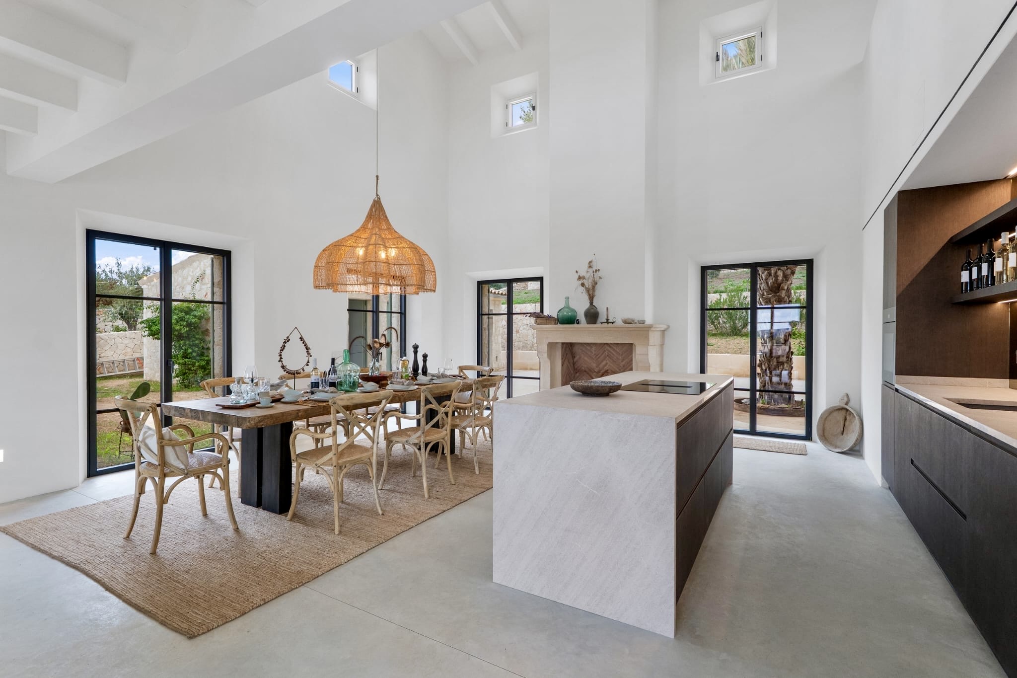 Una generosa sala de estar con techos altos, grandes ventanales y chimeneas abiertas que invitan al confort durante los meses más frescos.