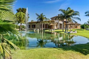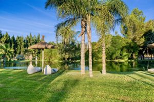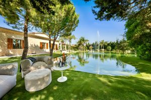 El exterior de la finca es igualmente impresionante: un extenso jardín mediterráneo rodea la propiedad, donde destacan una magnífica piscina que invita al relax y un gran lago que aporta un toque de serenidad natural al entorno.