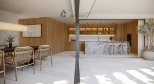 Una sala de estar, un comedor y una cocina de diseño abiertas al exterior, potenciando la luz natural y la ventilación cruzada.