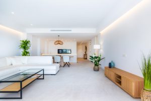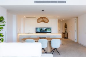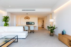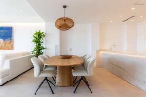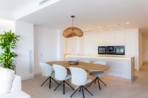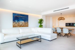 Gran salón-comedor de 60 m² con acceso directo a la terraza, ideal para disfrutar del mar y la brisa mediterránea.
