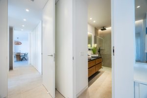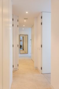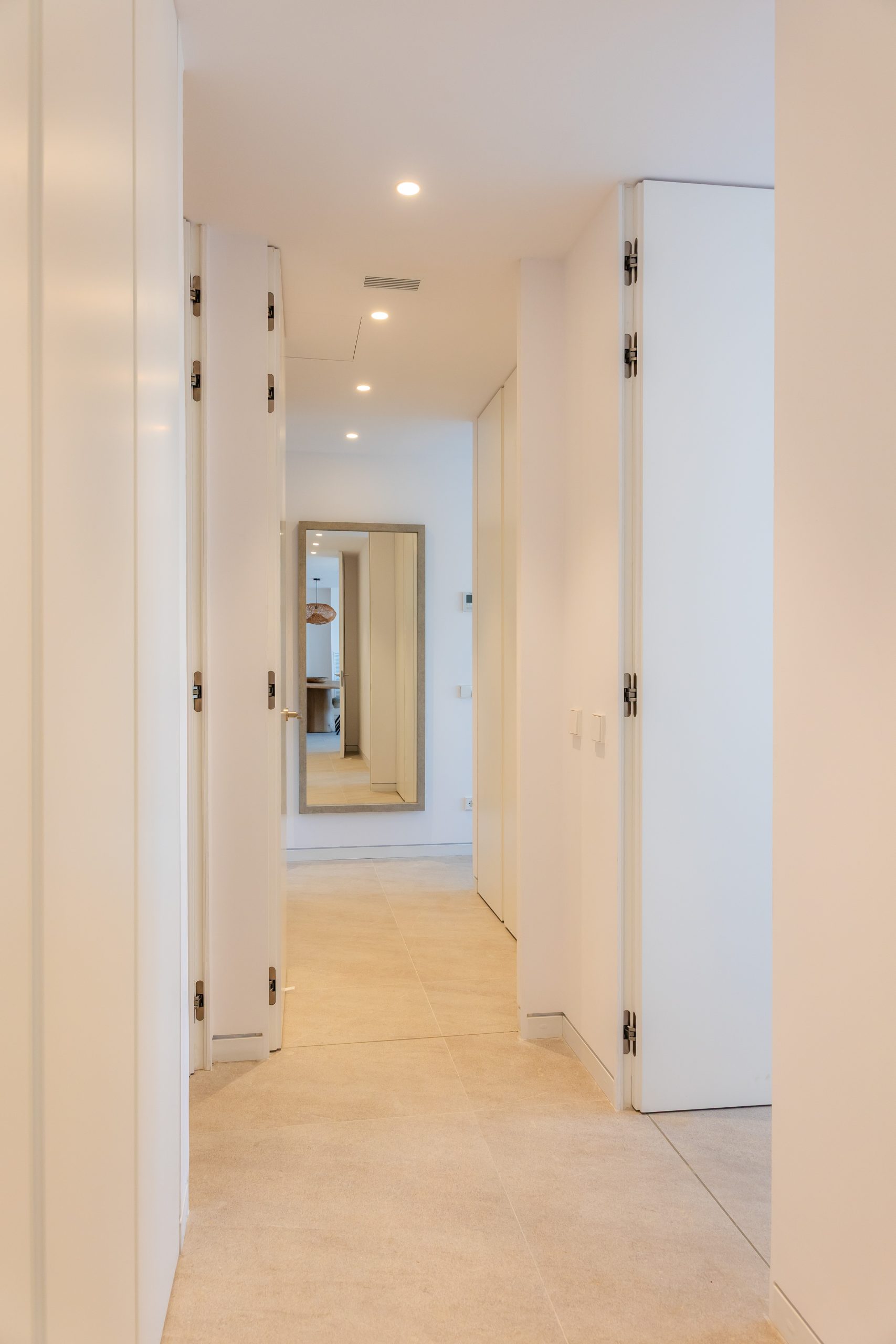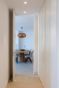 Carpintería interior lacada en blanco, con puertas hasta el techo que refuerzan la sensación de amplitud.