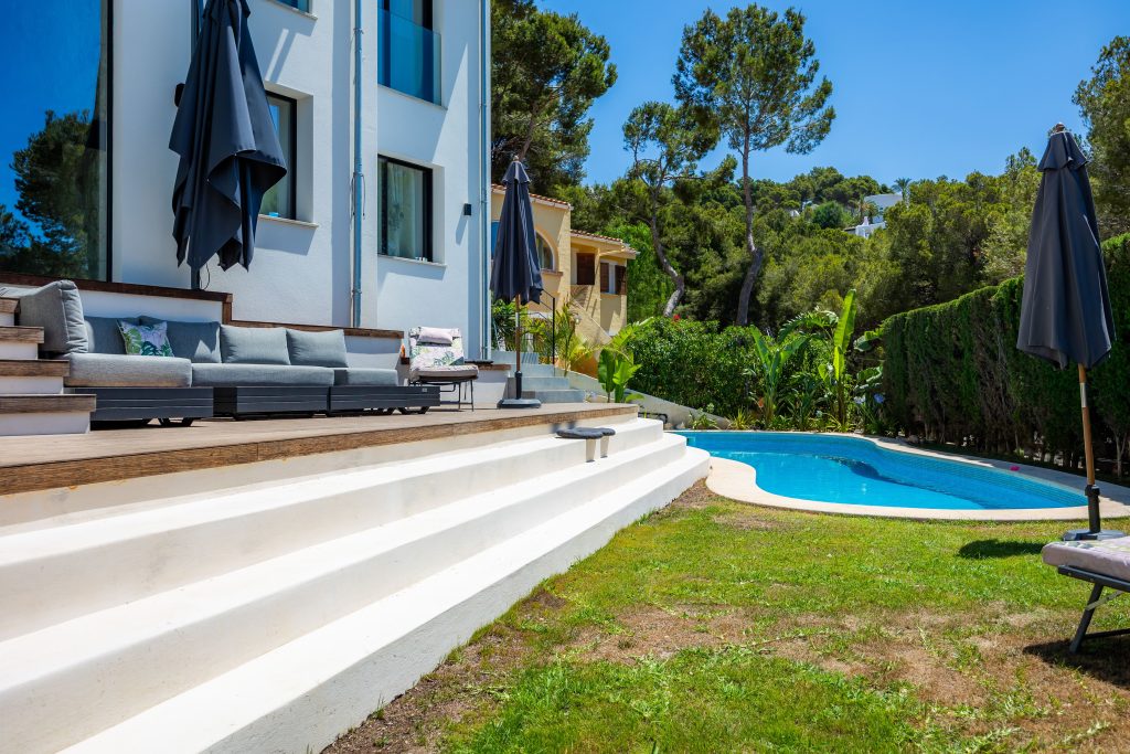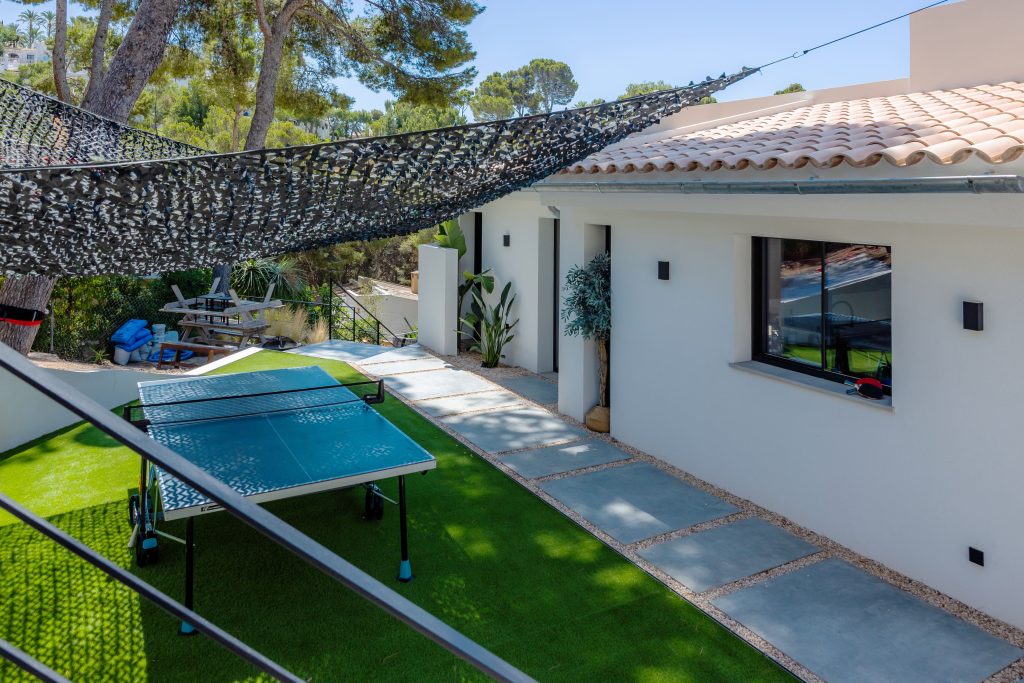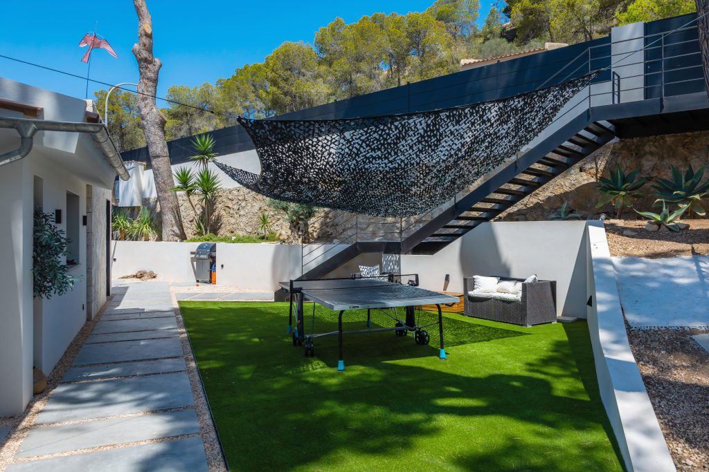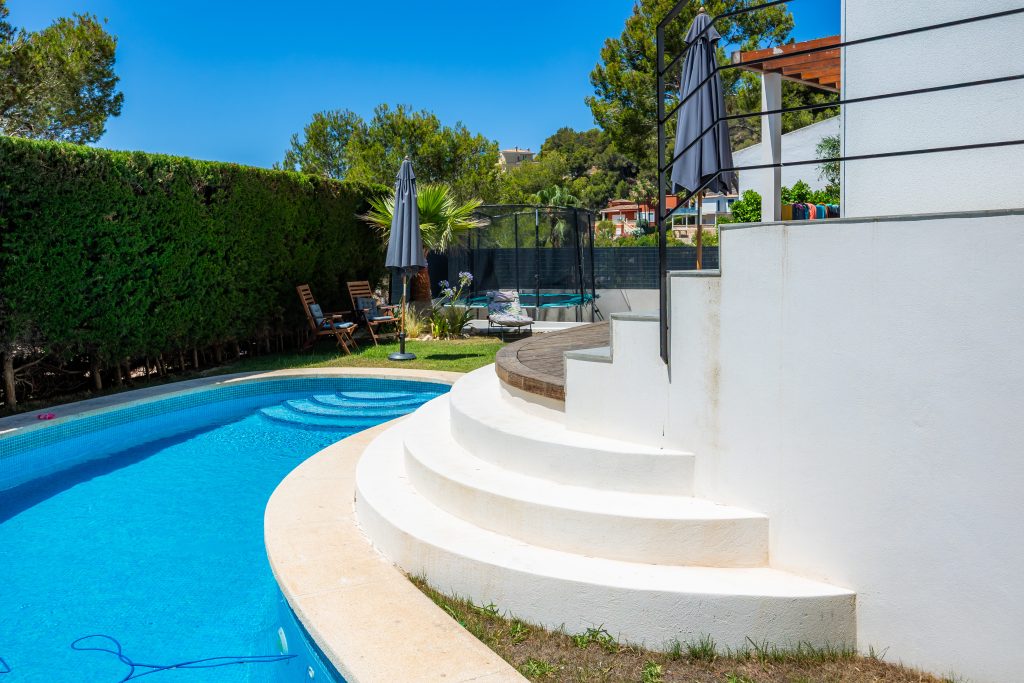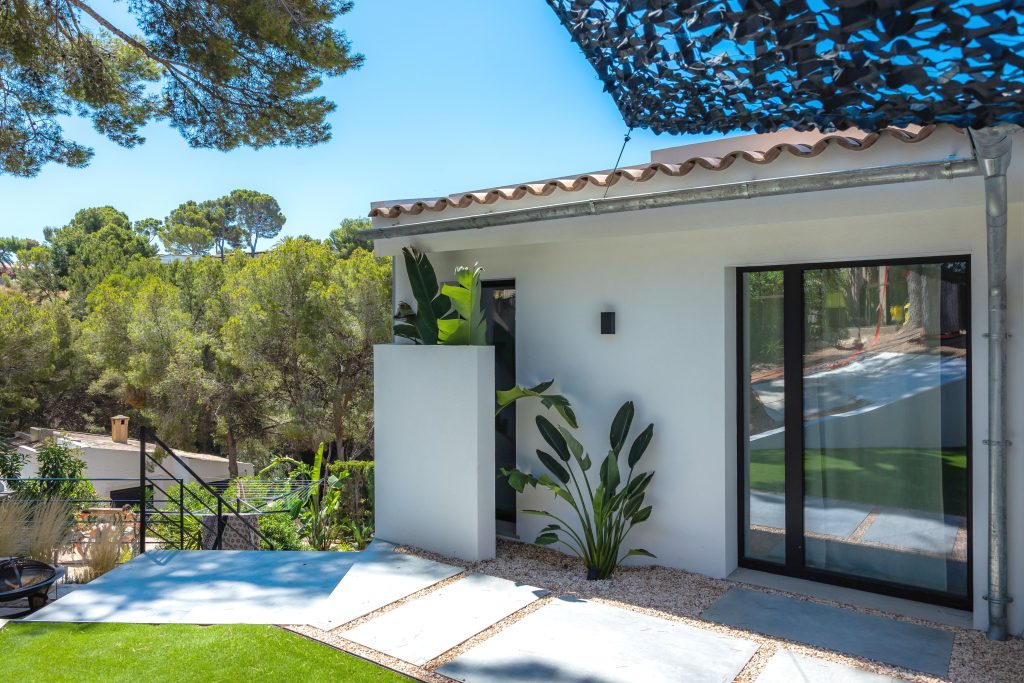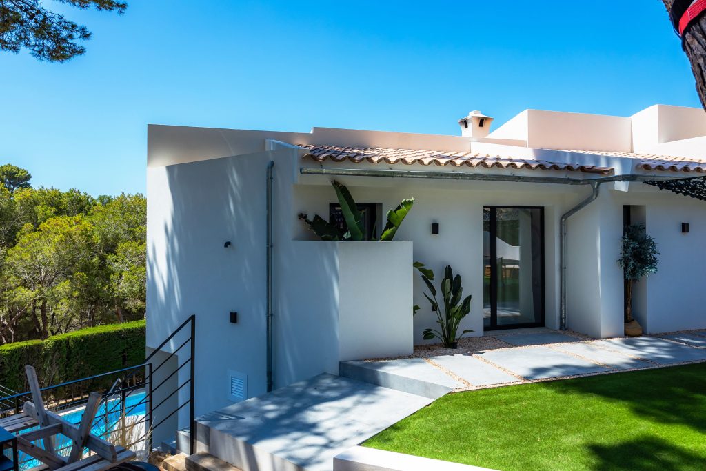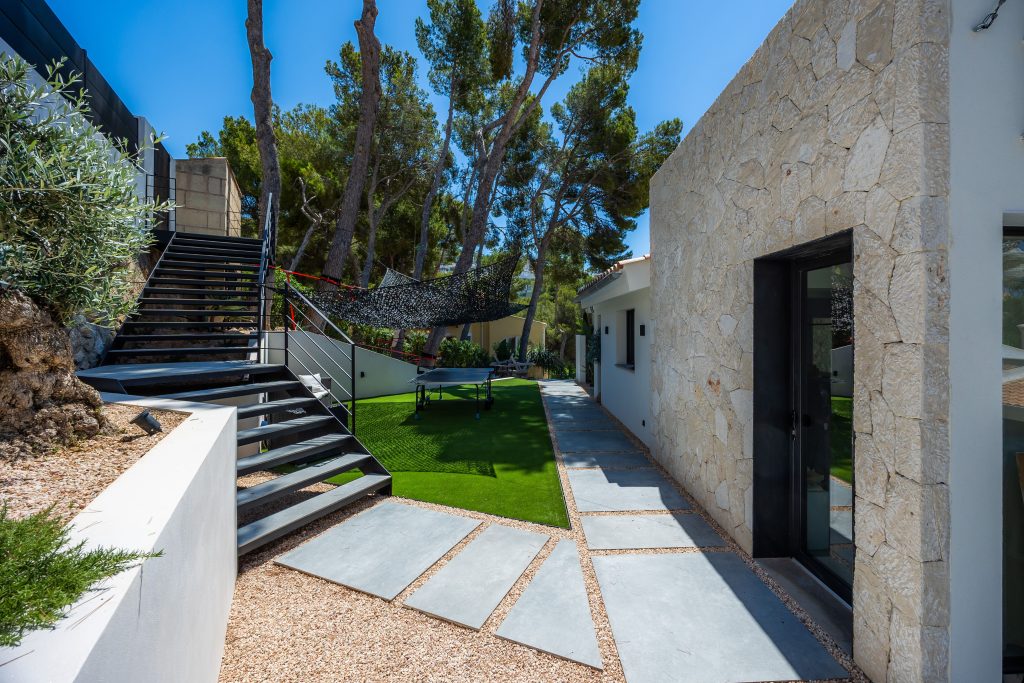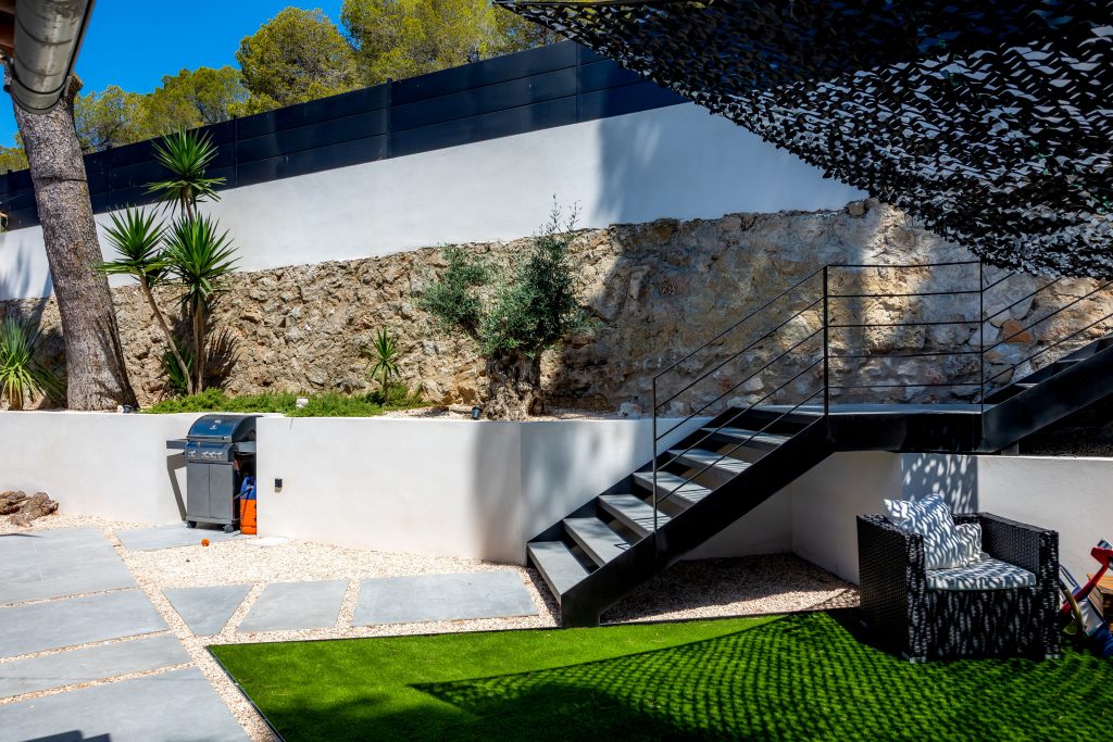 Entre las principales actuaciones llevadas a cabo, se destaca la construcción de nuevos muros perimetrales, tanto en los límites exteriores de la parcela como en zonas interiores estratégicas, con el fin de definir espacios, proporcionar mayor privacidad y reforzar la seguridad. Estos muros han sido diseñados con materiales de alta calidad, respetando los criterios estéticos contemporáneos que rigen el nuevo concepto visual del inmueble.