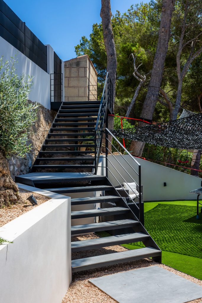 Se han ejecutado también nuevas escaleras de acceso en los frentes principal y posterior de la vivienda, las cuales han sido concebidas no solo como elementos funcionales, sino también como componentes arquitectónicos que contribuyen a una transición armónica entre los distintos niveles del terreno. Estas escaleras han sido diseñadas teniendo en cuenta la durabilidad, el confort de uso y la coherencia con los nuevos acabados exteriores.